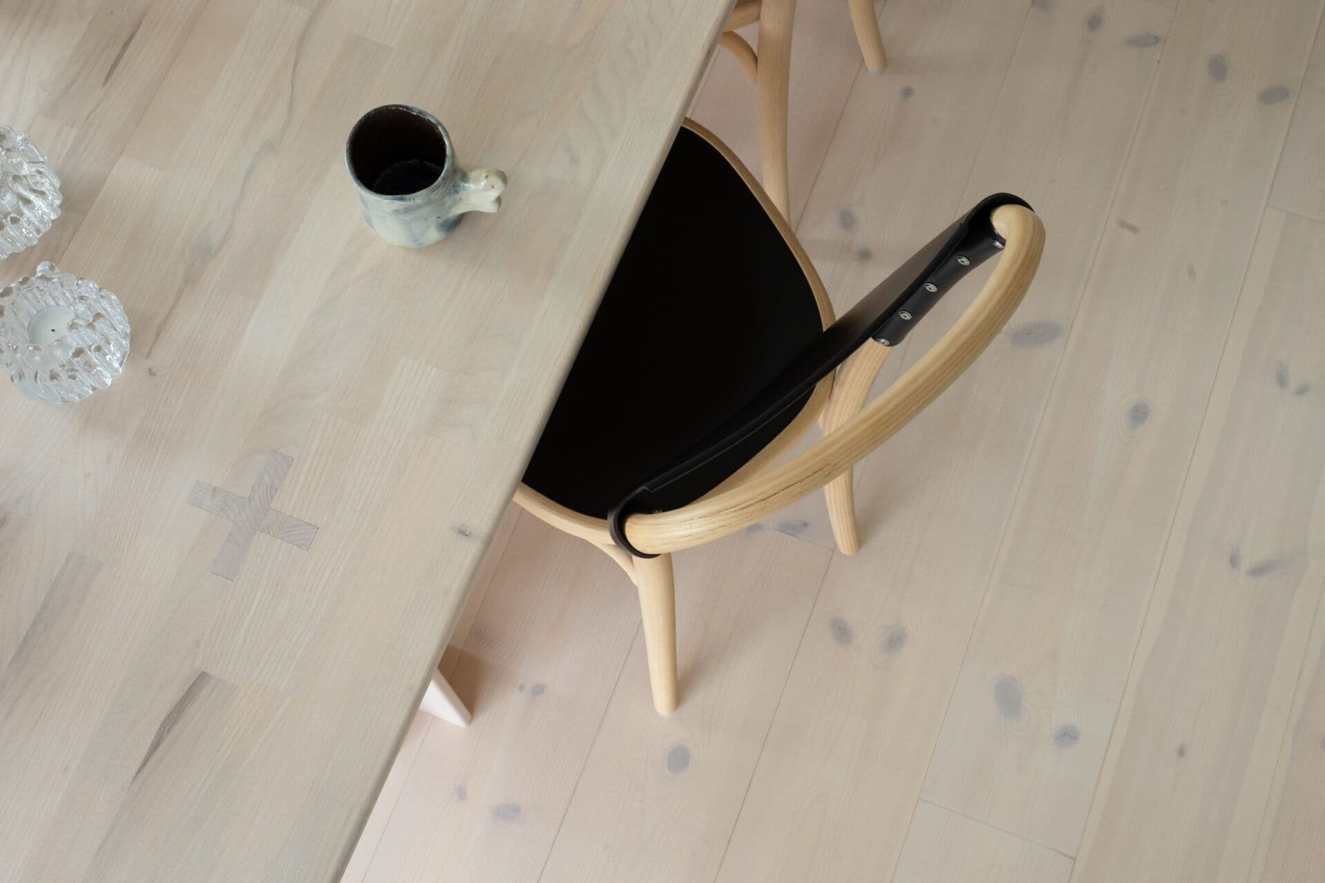 Den putsade parketten är bearbetad med sandpapper vilket ger en mjuk och slät yta, och den matta ytbehandlingen Ultra protect Vit gör det lättskött och hållbart. Furuparkett lämpar sig dessutom bra tillsammans med golvvärme, vilket i princip var ett måste i huset då fönstrens storlekar och placeringar gjorde det knepigt med radiatorer.