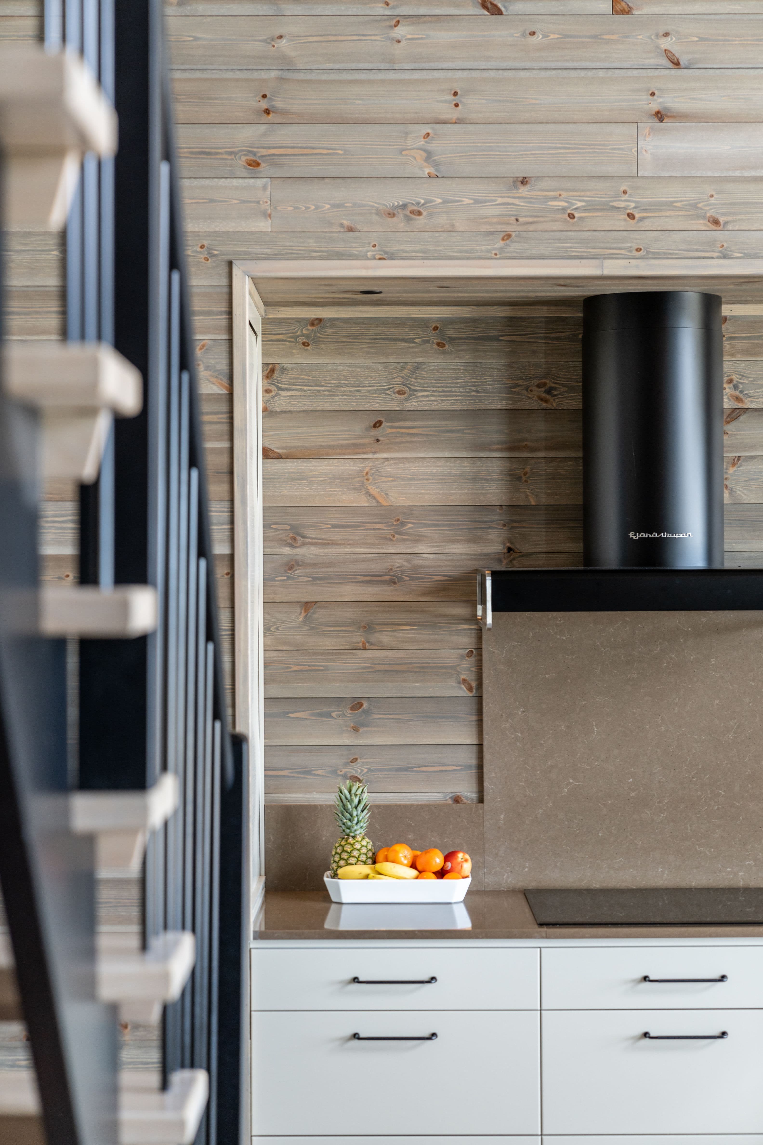 Och hon är supernöjd med sitt val av träpanel; och att använda samma träpanel från golv ända upp till nock i det stora rummet som har en öppen planlösning för kök och vardagsrum blev precis så bra som Frida tänkt sig.