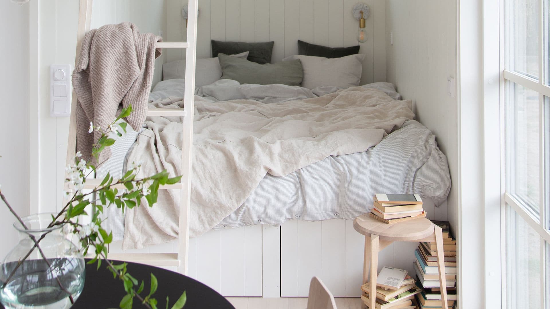 Av några spillbitar från träpanelen byggde familjen lådfronter till två stora lådor under dubbelsängen. Enligt Niki är smart förvaring en nyckel till att skapa det trivsamt och organiserat i ett litet boende. Niki tipsar även om att välja funktionella möbler som gärna har flera användningsområden. Deras soffa kan också bli en säng, och bordet kan göras större med iläggsskivor. Att bordet är runt gör att det tar upp mindre golvyta och är enklare att gå omkring.
