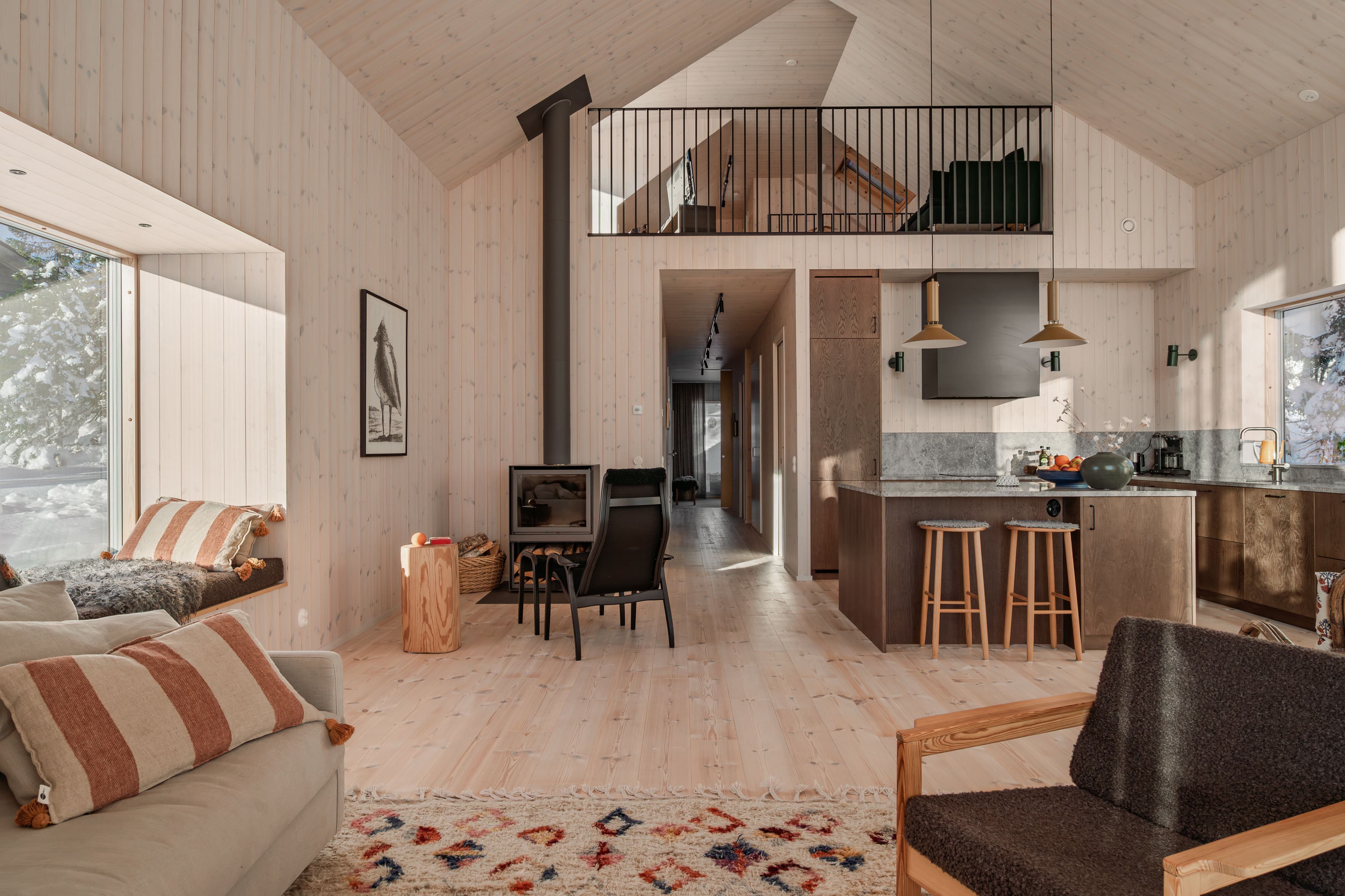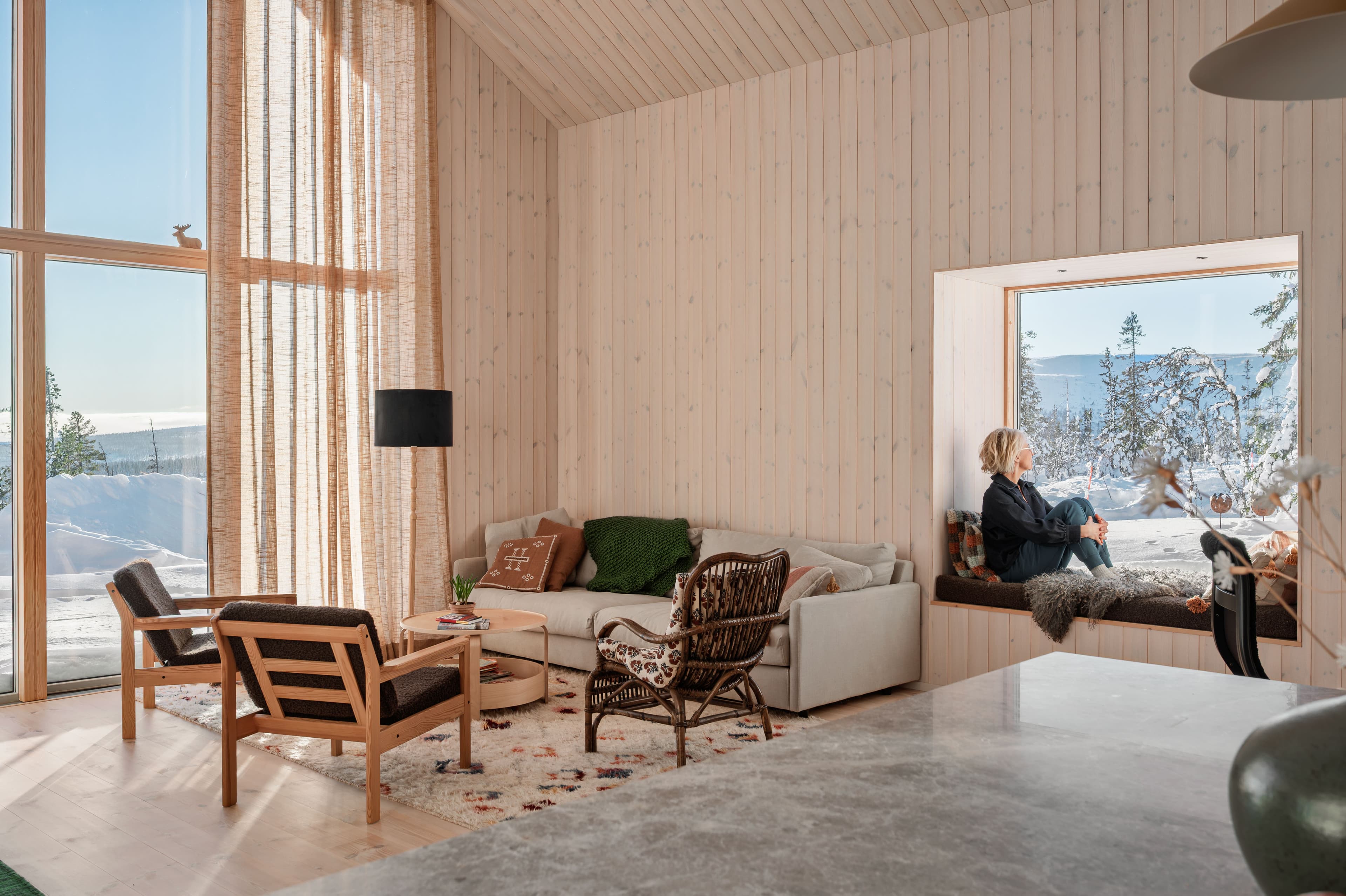Stora fönsterpartier placerades för att fånga utsikten mot kalfjället i väster. Samtidigt krävdes noggrann avvägning för att skapa avskildhet. Resultatet är en planlösning där naturen alltid är närvarande, men där huset ändå upplevs skyddat.