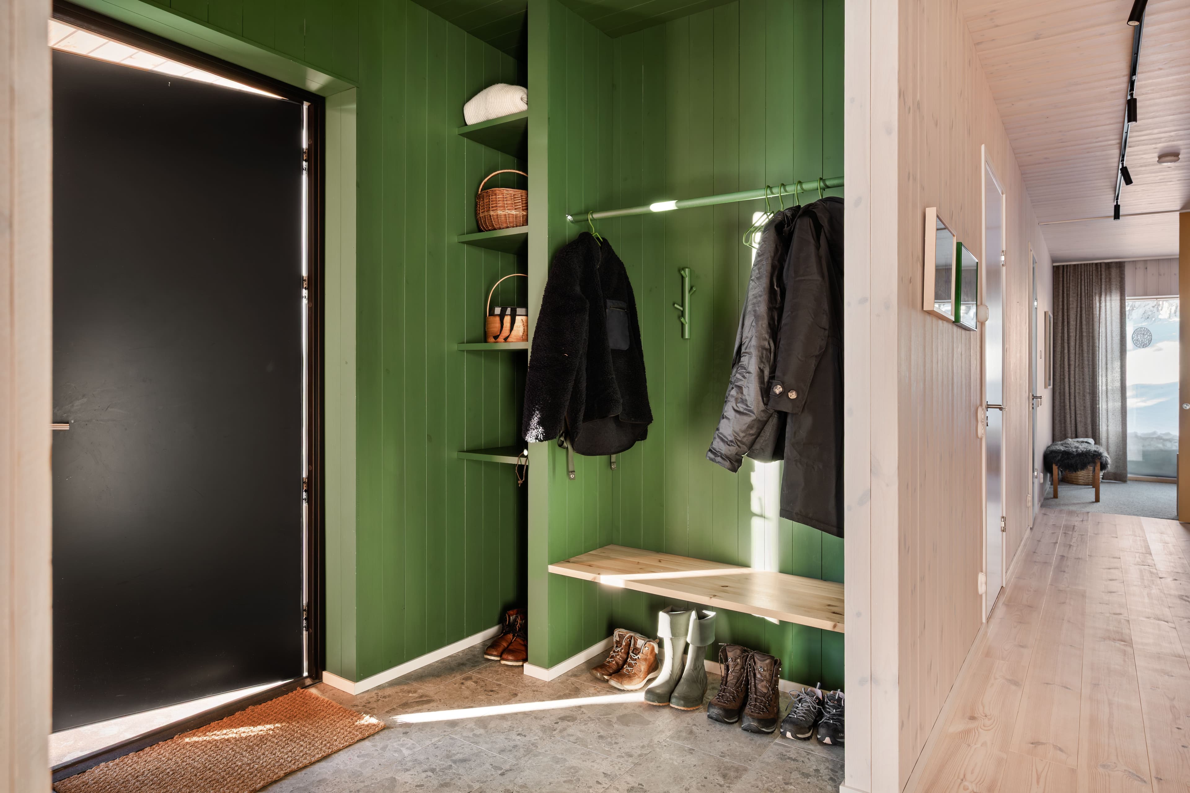I hallen målades en putsad slätspont i en varm grön ton, NCS s6020-G30Y. En kulör som plockar upp fjällbjörk, gran och blåbärsriset utanför dörren. Här märks hur träpanel kan anpassas efter rum och funktion, samtidigt som helhetskänslan bevaras.