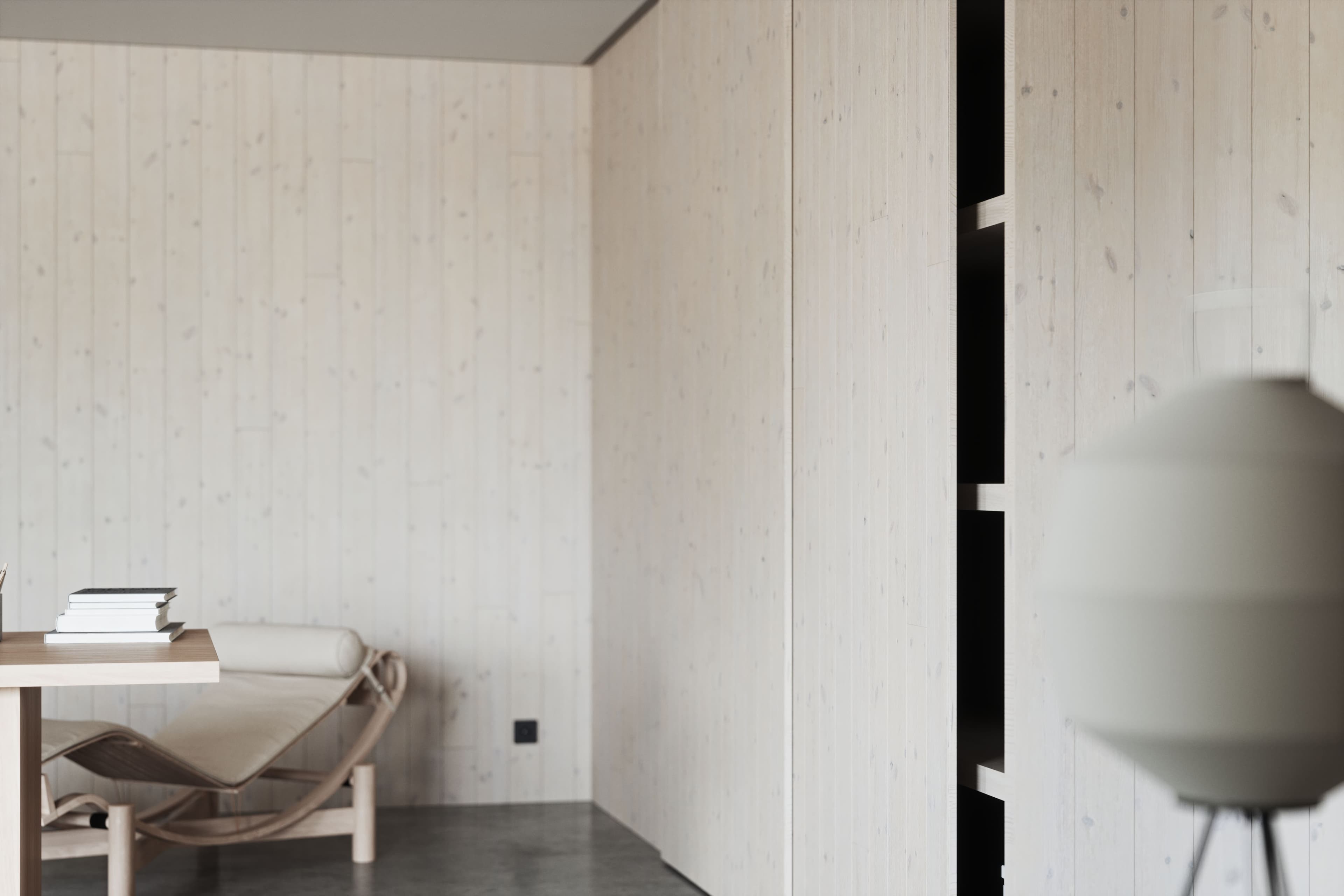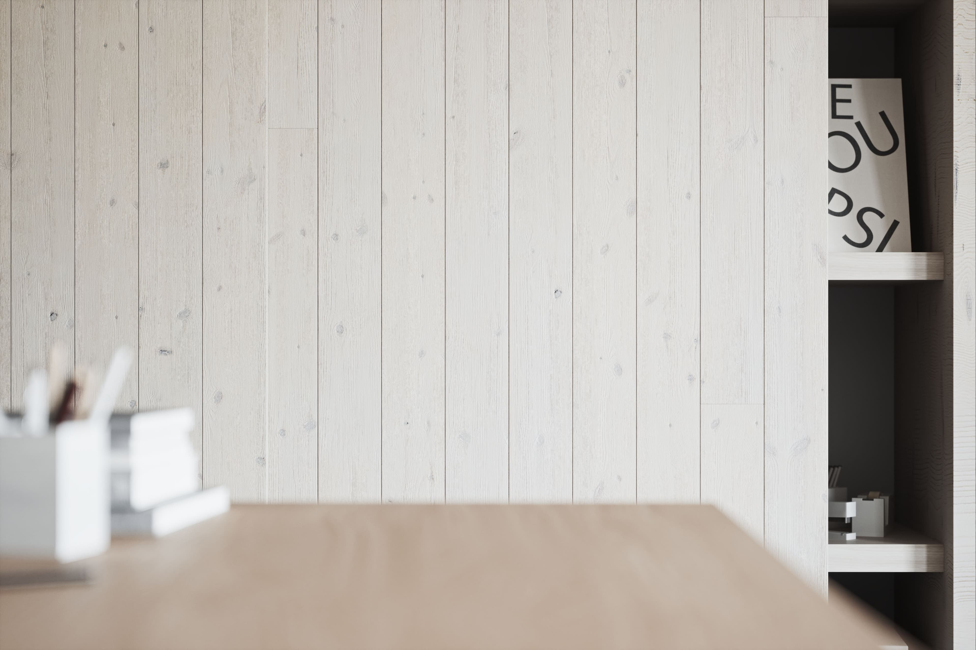 Borstad slätspont superlasyr vit ger en mjukt vit och livfull tak- och väggyta med vacker trästruktur.